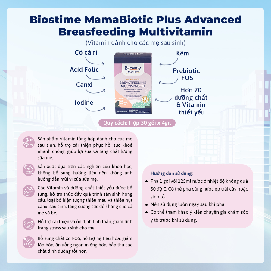 Biostime MamaBiotic Plus Advanced Breasfeeding Multivitamin là sản phẩm dành riêng cho mẹ giai đoạn sau sinh & cho con bú. Được nghiên cứu và chứng nhận bởi các chuyên gia dinh dưỡng hàng đầu tại Úc, sản phẩm không chỉ hỗ trợ sức khỏe của mẹ sau sinh mà còn giúp tăng lượng sữa và cải thiện chất lượng sữa mẹ để bé phát triển toàn diện.