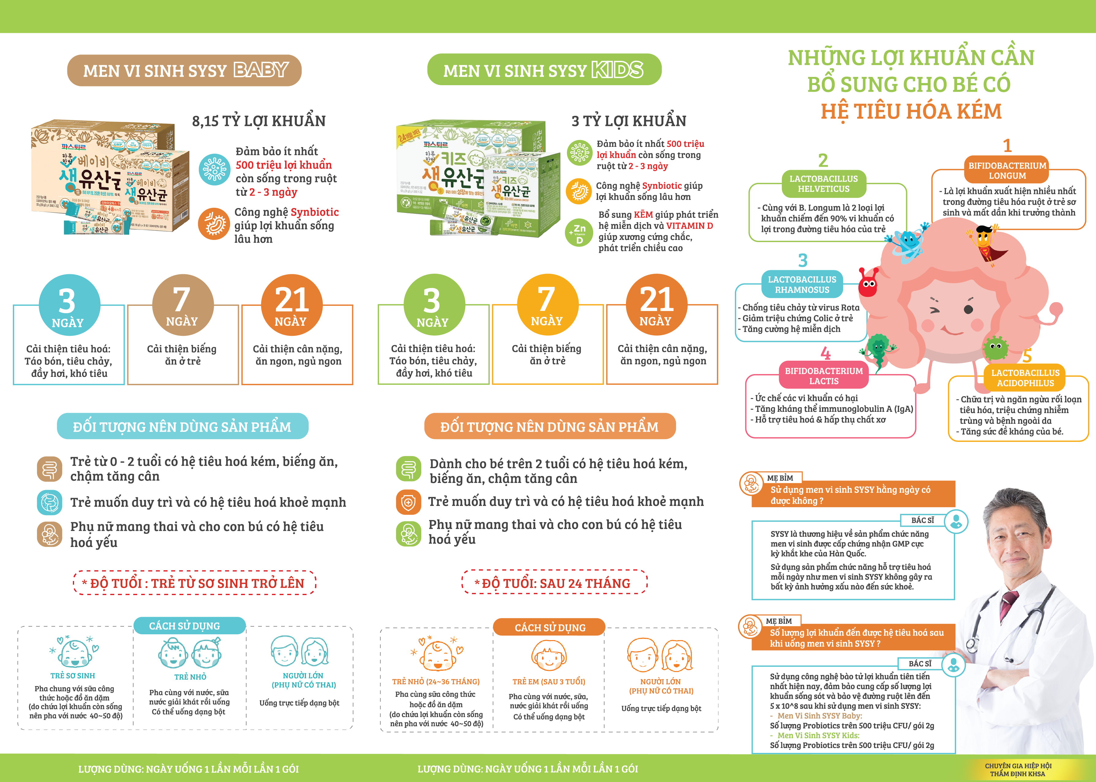▪ Men vi sinh BABY SYSY: Dành cho trẻ từ sơ sinh trở lên, chứa 8,15 tỷ lợi khuẩn quan trọng nhất cho đường ruột của bé, có tác dụng cải thiện tình trạng rối loạn tiêu hóa, giúp bé ăn ngon, ngủ ngon, tăng cường hệ miễn dịch.